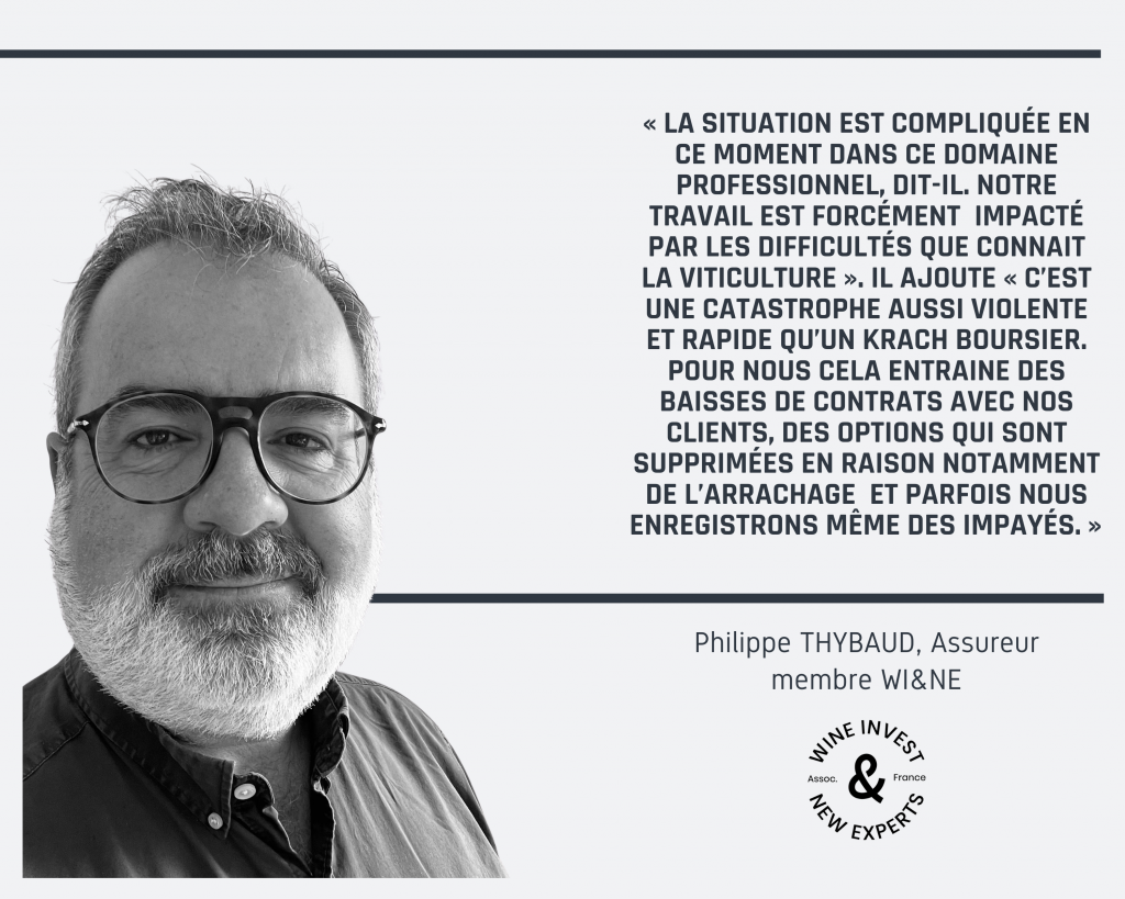 « La situation est compliquée en ce moment dans ce domaine professionnel, dit-il. Notre travail est forcément impacté par les difficultés que connait la viticulture ». Il ajoute « c’est une catastrophe aussi violente et rapide qu’un krach boursier. Pour nous cela entraine des baisses de contrats avec nos clients, des options qui sont supprimées en raison notamment de l’arrachage et parfois nous enregistrons même des impayés. »